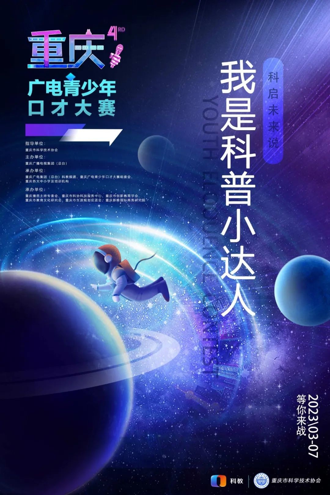 由重庆广播电视集团(总台)主办,重庆市科学技术协会指导,重庆播音主持专委会、重庆市科协科技服务中心、重庆市创新教育学会、重庆市教育文化研究会、重庆市生涯规划促进会、重庆新雅国际商务研究院支持,重庆广电集团(总台)科教频道、重庆广电青少年口才大赛组委会、重庆各大中小学及培训机构承办的——