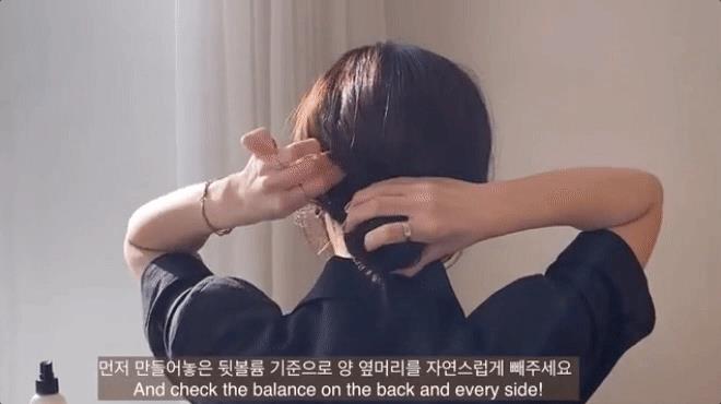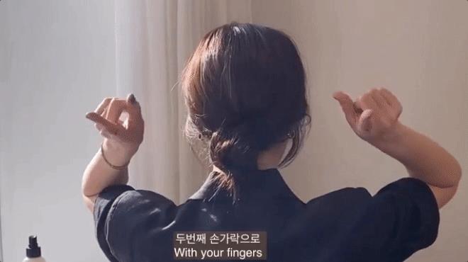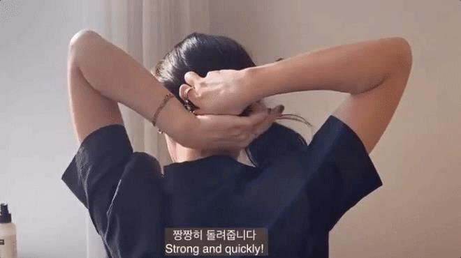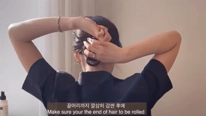 接着,抓起需要盘起的头发不停旋转,一直缠绕到发尾的部分在用发卡或发圈固定。