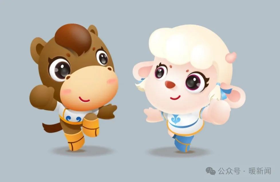 吉祥物鄂小马与暖小羊的灵感源于极具鄂尔多斯特色的动物“骏马”和“山羊”,结合Q版儿童形象的设计风格,融入“马兰花”等地域文化元素,直观简洁塑造出一对造型生动、欢快、可爱的IP形象。它们眼神明亮清澈、身姿灵动、神采飞扬、彰显了儿童朝气蓬勃和健康向上的精神风貌,“点赞”的手势传递了暖城的爱与温度。整体设计极具亲切感和辨识度,同时又不乏地域专属符号。