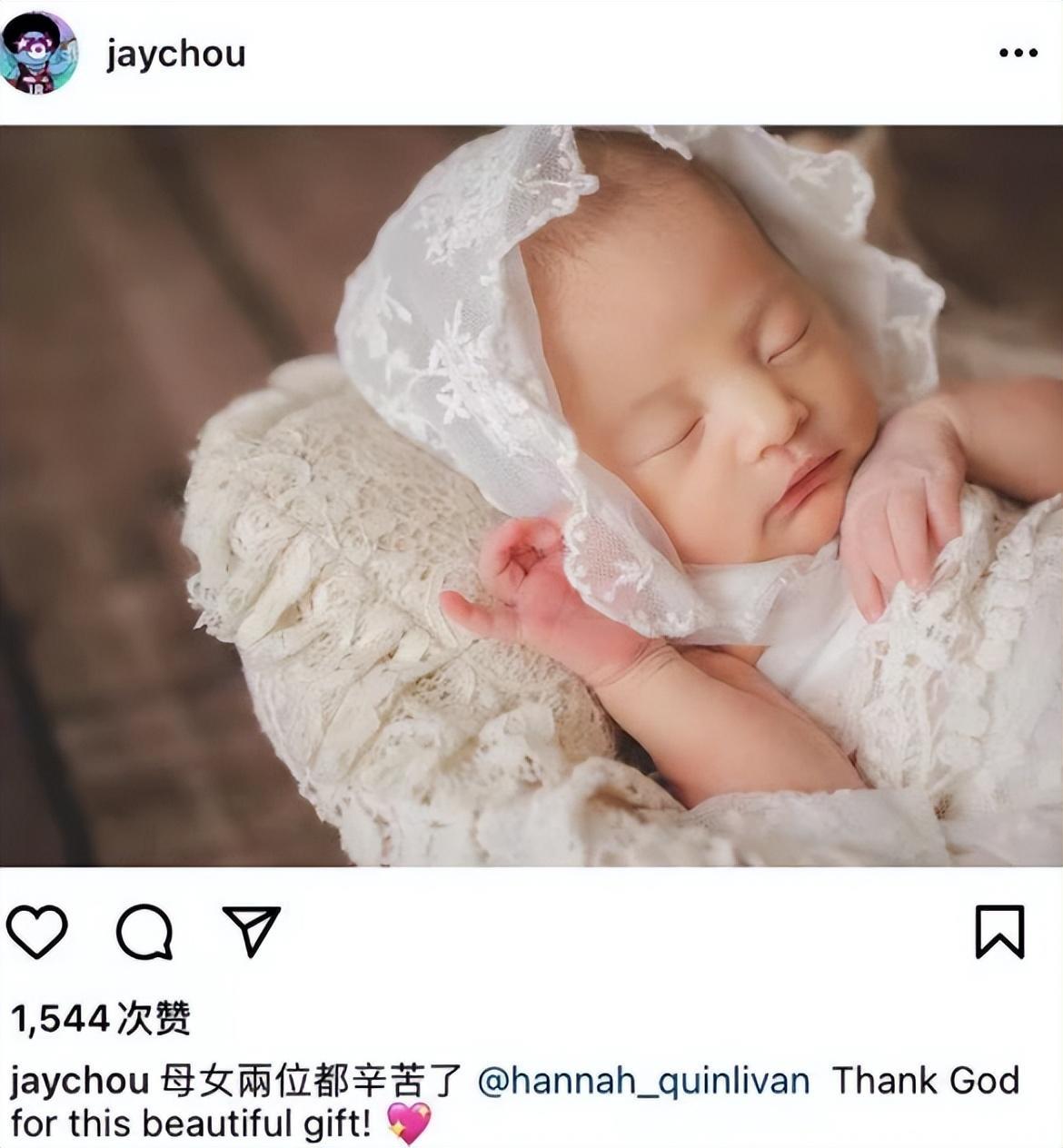 紧接着,周杰伦激动发文写道:“母女两位都辛苦了, Thank God for this beautiful gift! ”而且,周杰伦还大方晒出三胎宝宝正脸照。