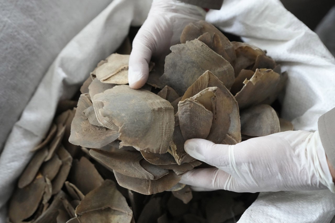 当地时间2023年8月17日,泰国曼谷,警察在新闻发布会上展示缴获的穿山甲鳞片。泰国当局说,他们查获了一吨多穿山甲鳞片,价值超过5000万泰铢(140万美元)。视觉中国/图