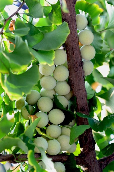 春夏之际,银杏树上挂着的小白果叫银杏果,这个果实是有微毒的。煮熟或者少量的用来煲汤,对人有一定的增滋补的功效。但是如果生食或者大量的食用,会出现恶心我、呕吐、腹泻、头痛,头晕、乏力、烦躁,甚至抽搐昏迷和脑水肿等症状