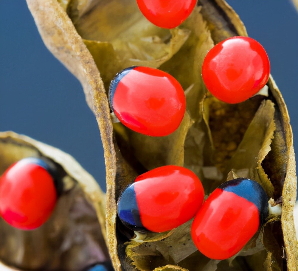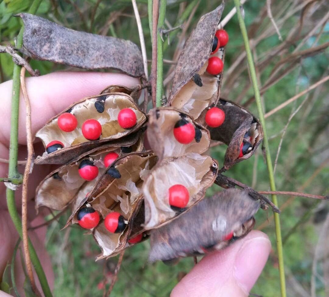 它是豆科植物中的藤本植物相思豆的种子,种子成熟时暴露于种壳之外,鲜红地挂在枝头,特别的好看。