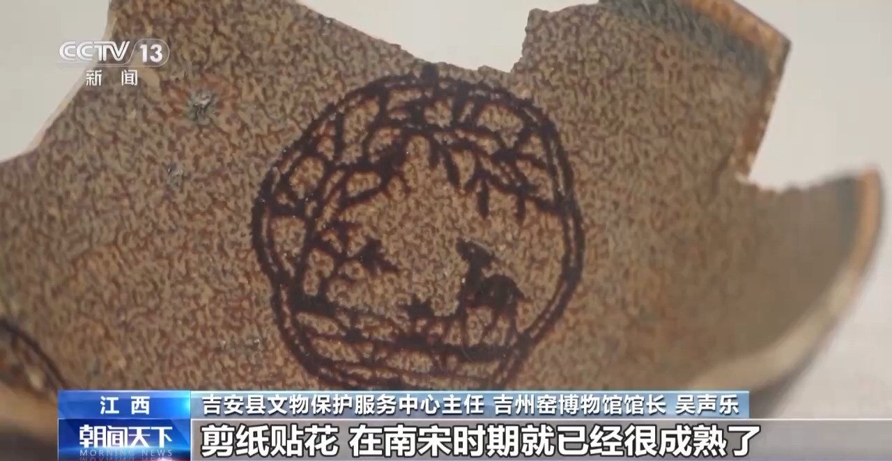 吉安县文物保护服务中心主任、吉州窑博物馆馆长 吴声乐:这是1981年在吉州窑肖家岭遗址出土的晚唐吉州窑青瓷碗,它的出土表明在晚唐时代吉州窑就已经在规模化烧制瓷器。南宋的釉上贴花鹿树纹盏,表明我们吉州窑的代表性陶瓷烧制技艺,剪纸贴花,在南宋时期就已经很成熟了。