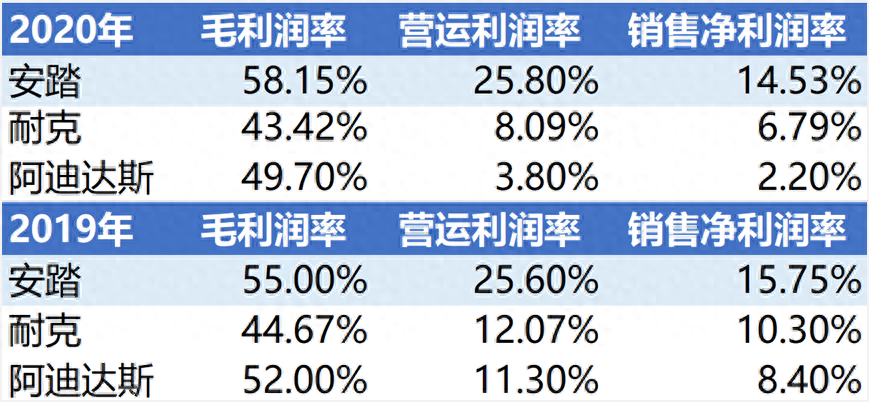 总结下来,安踏体育在营收规模上还远赶不上耐克、阿迪,但是利润率却显著高于这两家,所以在2020年疫情的影响下,安踏的利润超过了阿迪达斯。