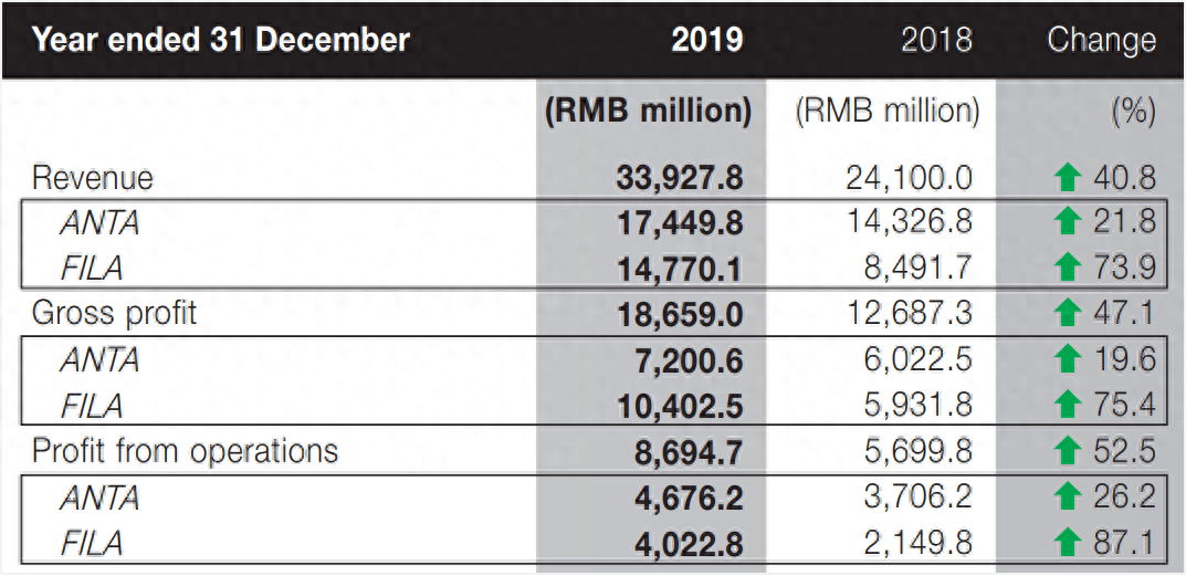 2019年安踏的营收构成中,安踏和FILA(斐乐)两个品牌占比分别为51.4%和43.5%,是营收贡献的主力军,其中FILA的增长尤为突出:营收增长73.9%,毛利润增长75.4%,经营利润增长87.1%。FILA品牌的崛起成了安踏体育增长的主要动力。