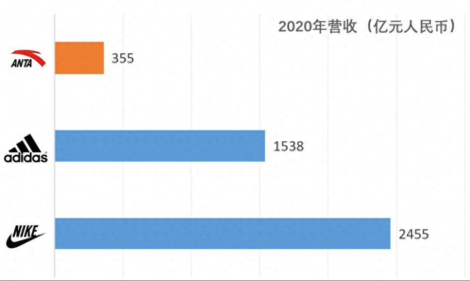 首先从营收规模上来看,安踏2020年的营收规模为355亿元人民币,阿迪达斯为198.4亿欧元(折合人民币约1540亿元),耐克为374.03亿美元(折合人民币约2450亿元),虽然安踏在主流品牌中稳坐第三,但是其和前两名的规模差距还是很明显的。