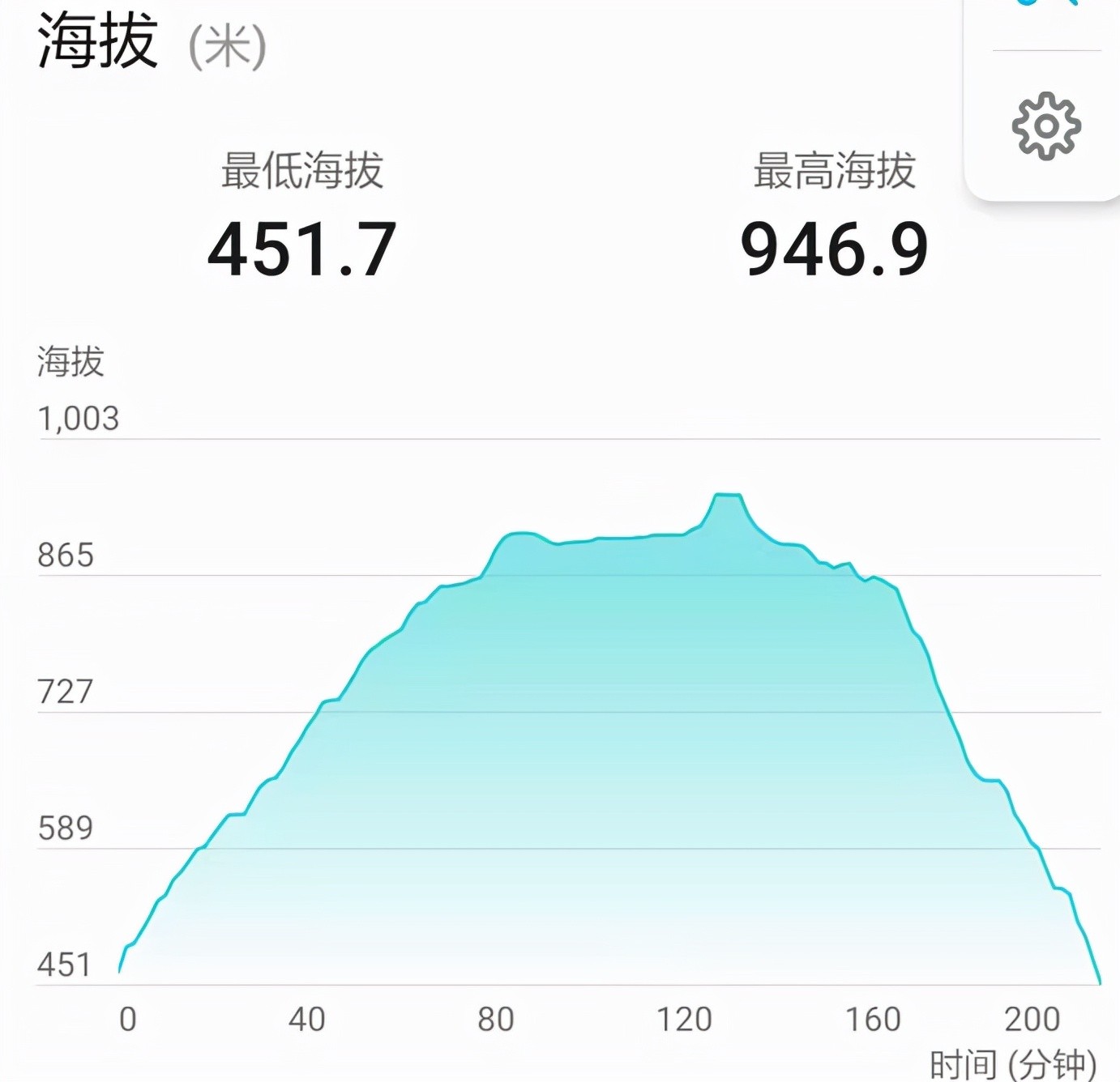 登山入口位置海拔约451米,登顶位置约945米,累计爬升503米,全程上山约3.8KM,全程约7.5KM,正常情况下需用时3个半小时,一次徒步能消耗934千卡的热量,相当于4个500ML的可乐的热量。