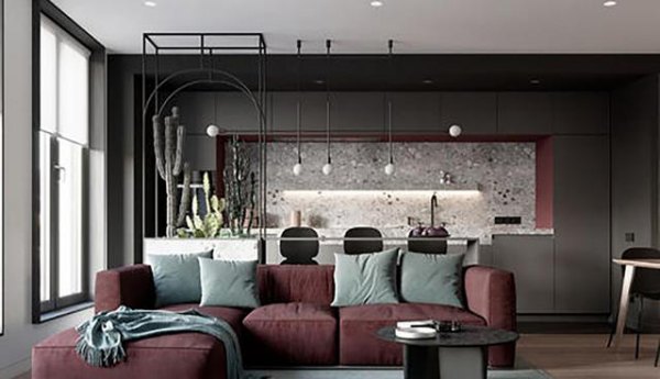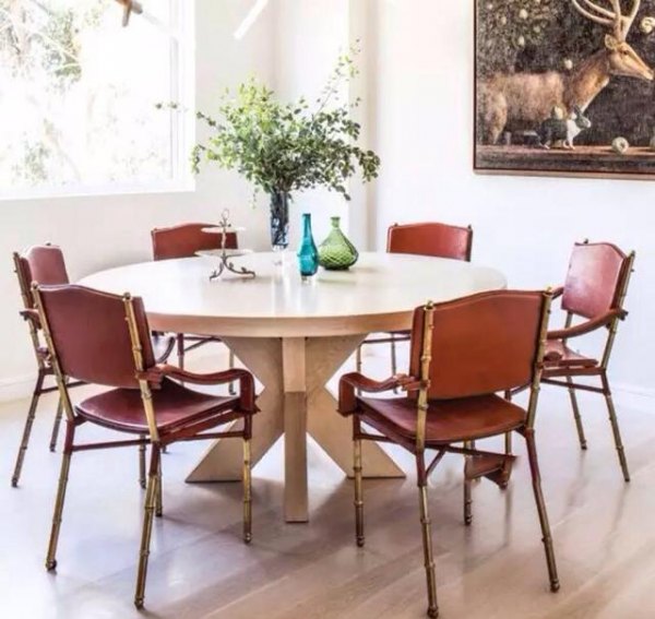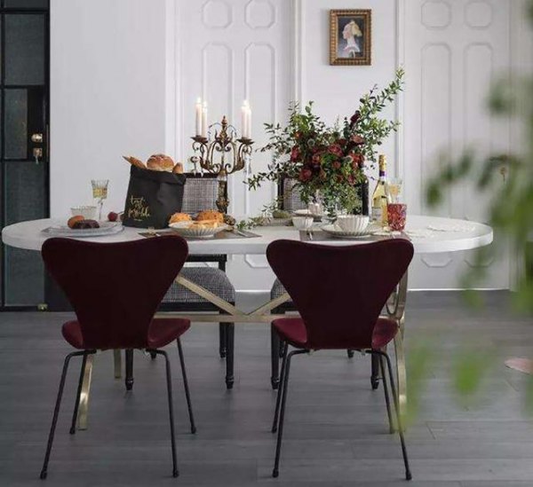 在这个安静的餐厅里,玛莎拉酒红餐椅仿佛一串诱人的宝石,天生的精致感与优雅气质使其更具魅力。背景墙和沙发座椅采用百合白,黄水仙色的装饰画、花瓶和餐桌支柱为空间加入一丝贵气。皮革棕的餐桌台面上摆放着树梢绿的鲜花装饰,让这个有格调的餐厅呈现出令人陶醉的自然气息。