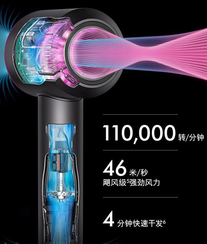 戴森的贵,首先体现在技术上。核心是它自研的V9高速马达,转速高达11万转/分钟(普通吹风机2-3万转),而这个小马达,戴森花了8年时间、砸了1亿英镑才搞出来,而且还借鉴了航空制造技术。