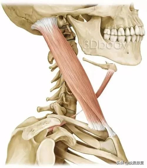 起于胸骨柄及锁骨的胸骨端(锁骨的内1/3),止于颞骨的乳突(耳垂的平后方约 1 指宽的地方,有一个骨性突起)。功能为单侧收缩使颈椎侧屈,双侧收缩使头部后伸;协助吸气。