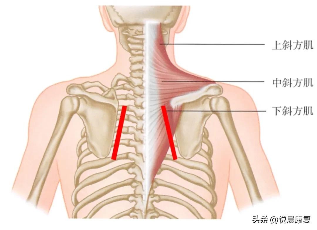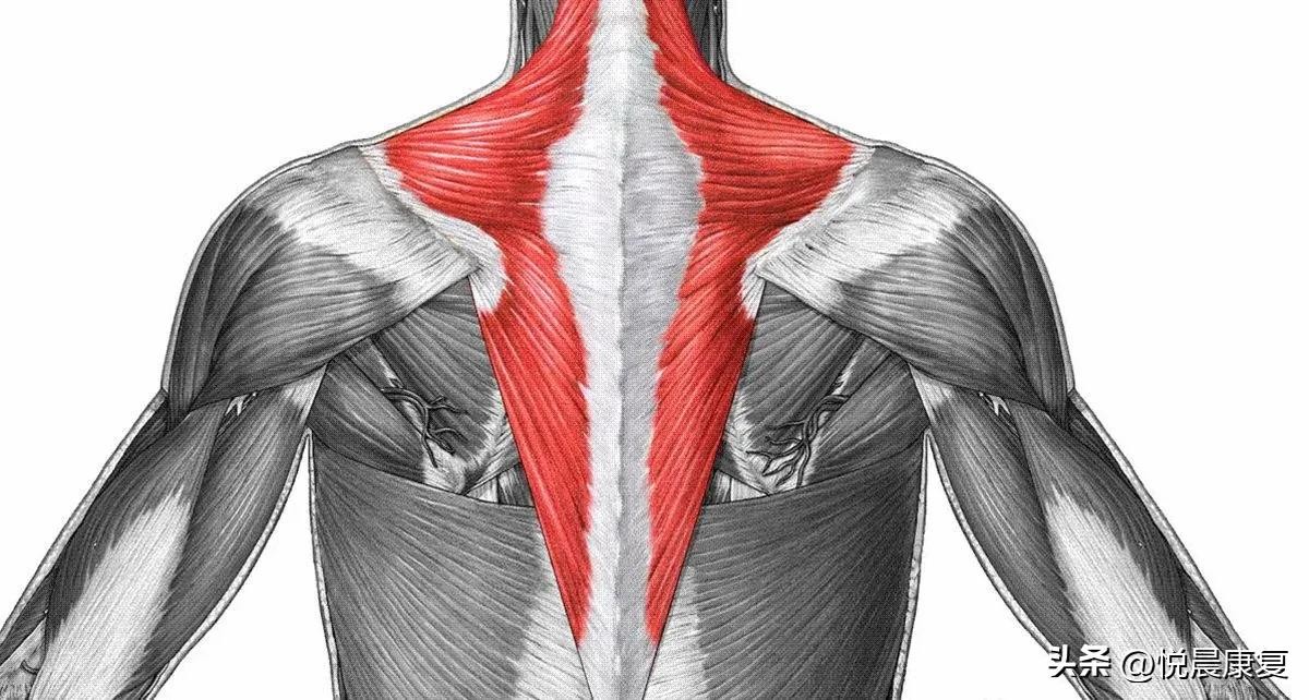 起于上项线、枕外隆凸、项韧带,第七颈椎棘突、全部胸椎棘突及其棘上韧带;止于锁骨外1/3、肩峰、肩胛冈。作用使肩关节外展。