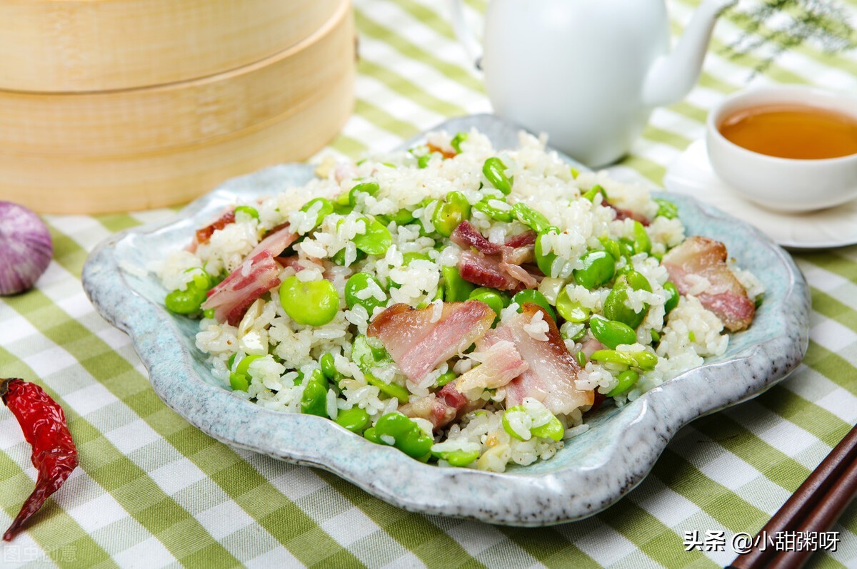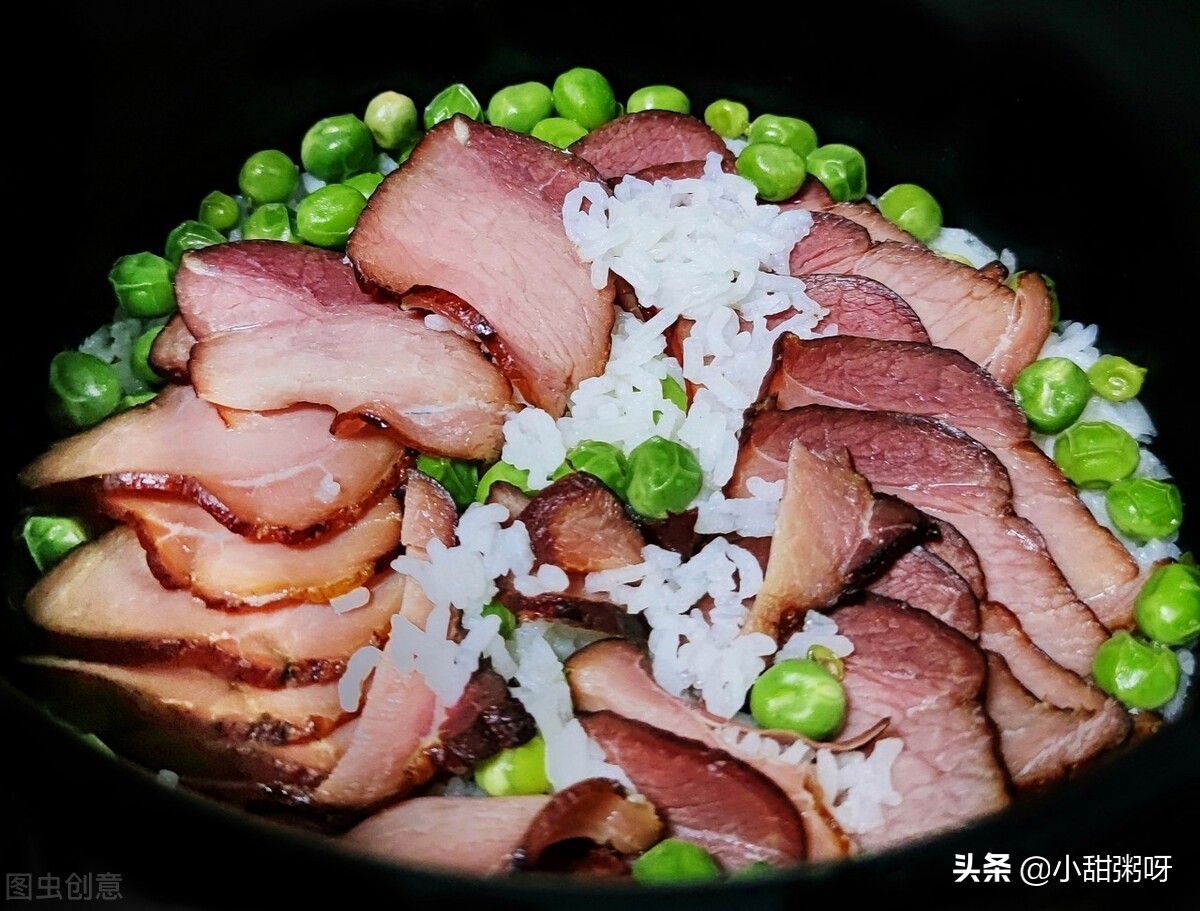 一道炒豌豆,既可以当菜,又可以加米饭一起炒当主食,一举两得。豌豆焖、炒饭的时候直接将洗净的豌豆放进电饭锅中,按煮饭档,跟米饭一起出锅,焖好的豌豆特别的软糯,加上腊肉会更香。