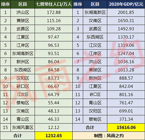 武汉各区人口一览:武昌区109万,蔡甸区55万