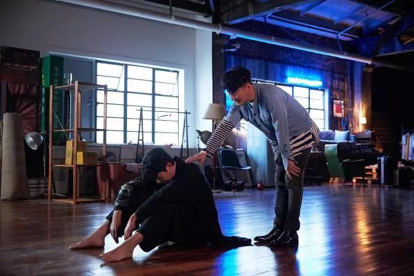 还有一个镜头很感人,艾伦在宽广的练舞厅里思念好友,伏膝流泪,张信哲站在他身后,没有说话,只是伸手握住他的肩膀。这无声的支持,已经胜过千言万语了。