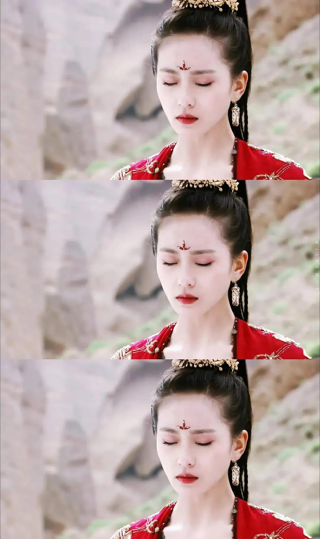 这是最爱的妆造,沙漠里和陈靖仇告别,但是放不下面子,所以含着泪拥抱他说了“你要记得,这里有一片美丽的沙漠”。