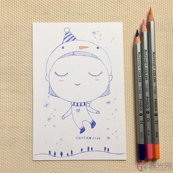 首先我们画出小娃娃圆圆的头部,然后画出她的五官和帽子,接着画出她的围脖,之后画出她的身体,最后给小娃娃身边画一些雪花和小树并上色,这样小娃娃简笔画就完成啦!
