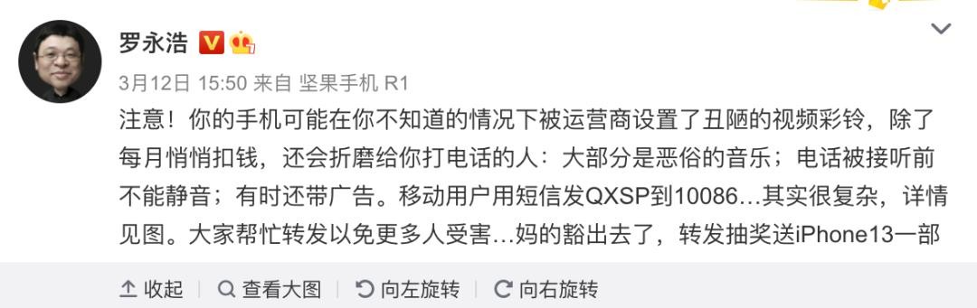 「生活」罗永浩吐槽运营商擅自设置视频彩铃扣钱 教大家关闭
