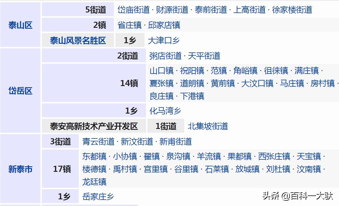 市辖区:泰山区、岱岳区县级市:新泰市、肥城市县:宁阳县、东平县