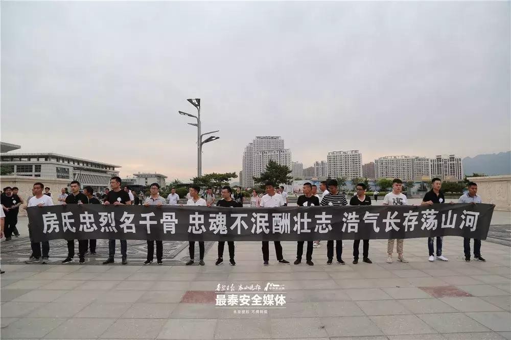“迎接房浩烈士英灵回家”几个大字在正中,左右各安放有2个花篮。群众手持横“向房浩烈士致敬”“房浩烈士永垂不朽” “房氏忠烈名千骨 忠魂不泯酬壮志 浩气长存荡山河”“献身国防英名传万代”“新泰人民迎接房浩魂归故里”“离家是少年 归来是英雄”“英雄房浩 一路走好”等横幅,庄重等候。