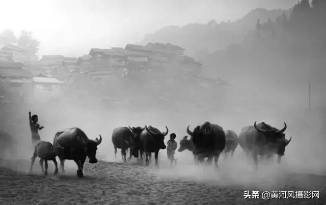 作品摄于贵州黔东南卡寨,座落在一座地势险要的半山腰上,远远望去,寨上一座座高耸入云的楼房锁在烟雾中时隐时现,充满了神秘的色彩,儿童放牧的欢腾场景,为神秘的古寨增添了生活的气息。