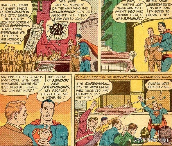 超人和吉米.奥尔森把自己变小跟踪袭击者来到了坎多城中,发现坎多城中开始大规模的反对超人,还扳倒了超人的雕像。
