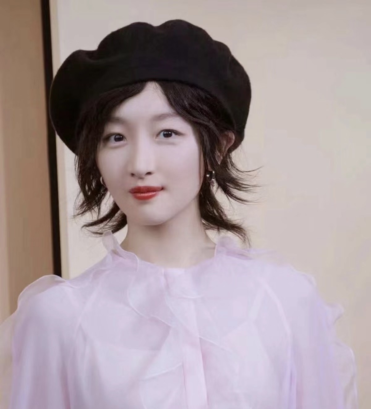 但她的面部线条流畅,五官精致,小小的眼睛笑起来,