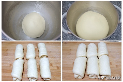 8、发酵好的面团取出来,分成均匀的6等份, 每个面团150g左右。分割后的面团,用擀面杖擀开排气,顺热卷起来,放到一边,全部卷好以后盖上保鲜膜,醒面15分钟。醒面之后,面团又变得白白胖胖的了;