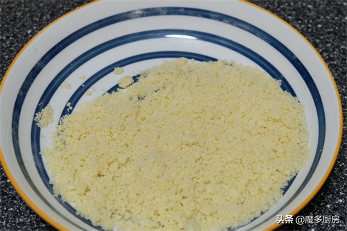 10、将盘子里的四种原料混合在一起,搓成细碎的颗粒状,放到一边盖上保鲜膜备用;