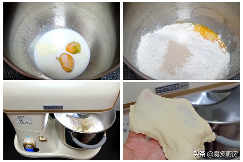 用厨师机揉面的好处就是容量大、揉面快,轻轻松松揉出手套膜,也是制作吐司面包的重要步骤之一。这个配方可以做两个450g吐司,如果手工揉面或用面包机揉面,建议减少份量,做1个吐司会更轻松一些。