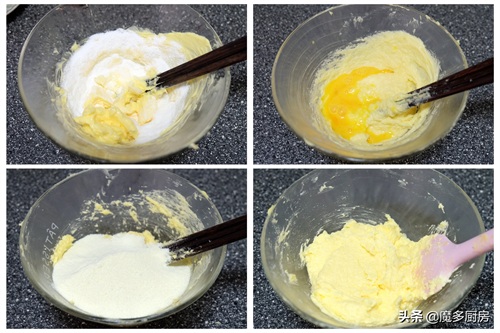 12、取一个大碗,将软化的黄油放到大碗里,倒入糖粉,搅拌均匀。黄油和糖粉混合均匀后再分两次倒入鸡蛋液,每次都是混合均匀后再放下一次。再倒入奶粉,继续混合均匀,奶酥馅越来越丰富了。