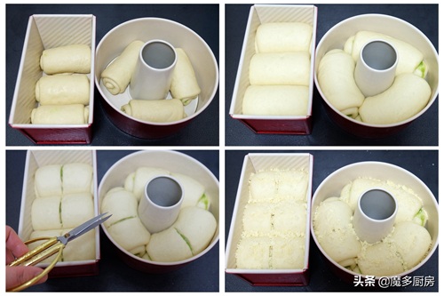 17、依次做好6个裹了馅的面包卷,可以放在两个450g吐司盒里,但我只有一个吐司盒,所以另外三个面包卷放在了一个8寸中空模具里了;包上保鲜膜放到阳台阳光下,或者把模具放到烤箱里,放一盘热水增加湿度和温度帮助发酵。