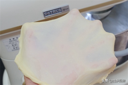 6、揉好的面团再扯出一小块,放在手上拉伸,能够拉出这种薄而不破、透明的膜,这个面团就揉好了;