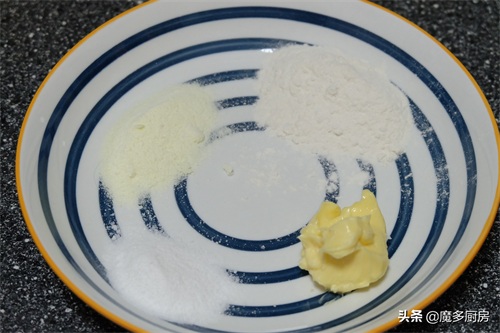 【表面奶酥粒原料】:动物黄油15g、奶粉5g、普通面粉20g、糖粉6g;