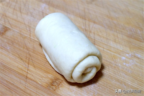16、从一侧卷起,不要太使劲,自然卷起就可以,收口的地方用擀面杖擀薄一点,压在最下方即可;