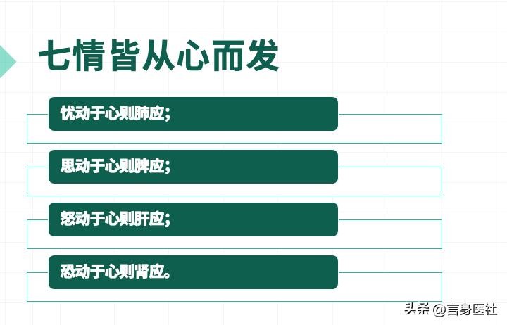 《类经·疾病类·情志九气》说:“心为五脏六腑之大主,而总统魂魄,并赅志意。故忧动于心则肺应,思动于心则脾应,怒动于心则肝应,恐动于心则肾应,此所以五志惟心所使也。”