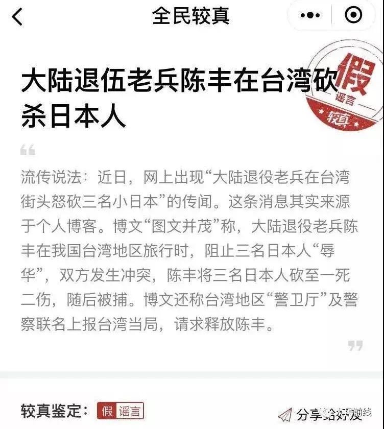 谣言二:退伍老兵陈丰在台湾砍杀日本人