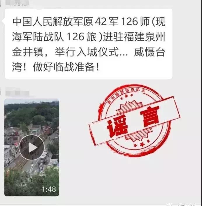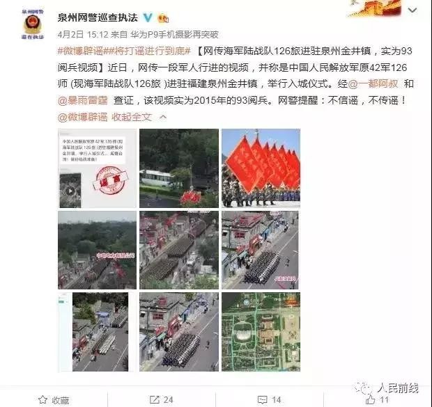 4月2日下午,“泉州网警巡查执法”发布了官方微博称:网传海军陆战队某旅进驻泉州金井镇,经@一都阿叔和 @暴雨雷霆查证,该视频实为2015年的9•3阅兵。