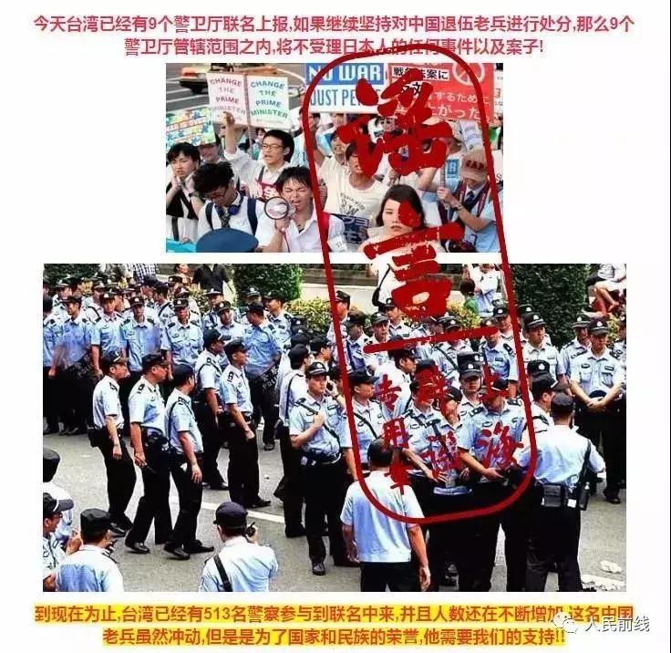 今年3月,有一热传网帖称:“退伍老兵陈丰”携妻子到宝岛台湾旅游,见3名日本人在街上当众焚烧中国国旗,双方产生冲突,导致一死二伤。网帖还称,我国台湾地区已经有513名警察参与到联名中来,并且人数还在不断增加,这名老兵虽然冲动,但是为了国家和民族的荣誉,呼吁网友们转发支持“陈丰”。