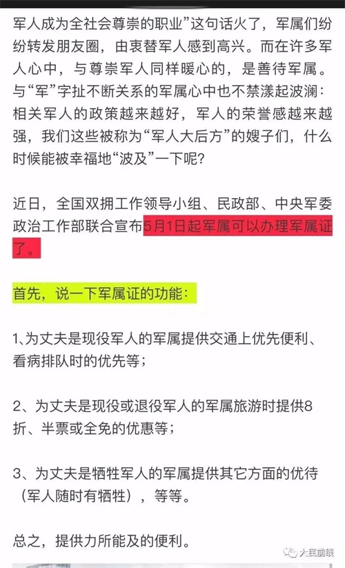 今年3月,有涉军自媒体发布消息:5月1日起军属可以办理军属证。对此,一些不明真相的军属,欢呼雀跃,纷纷转发。