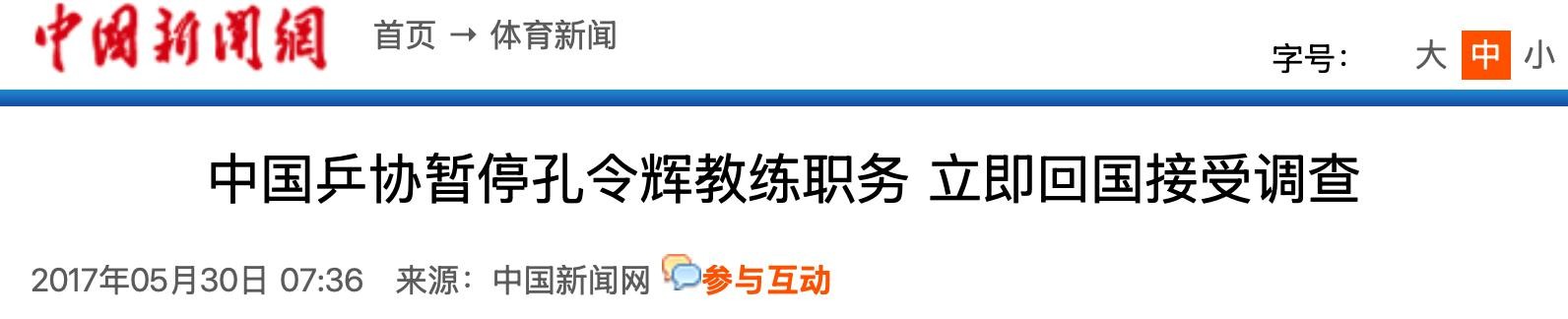 中新网|中国乒协暂停孔令辉教练职务 立即回国接受调查