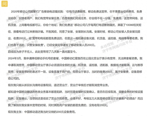 近日,济宁名城事小编相关渠道获悉,有网友在济宁市网络问政平台投诉举报济宁移动营业厅的相关问题,网友表示几年前移动公司打骚扰电话推销套餐业务,并表示”移动免费送宽带、送机顶盒、回馈老用户“等,这种推销电话几乎每周都来电骚扰,屏蔽10086相关信息后换着电话打来推销,之后同意安装并按照完毕后,移动公司安装人员提出收费200元,并表示“宽带和电视都是免费送的,这200元是一堆机器设备等所需的费用,”直到今年3月申请降低移动手机号的套餐,中国移动红星路百花公园北营业厅表示有宽带,无法降套餐资费,并且须退回相关设备等才能取消宽带,这与推销宽带、安装宽带时的表述不一致,营业厅表示交的200元属于安装费,设备是移动公司的。安装时反复确认是否存在取消、调整业务时的陷阱,没想到还是低估了移动营业厅的套路,这不是移动营业厅诈骗客户吗?后来得知同村其他用户安装的都是免费的,没有收取200元,对此,主张移动营业厅退还当时缴纳的200元。