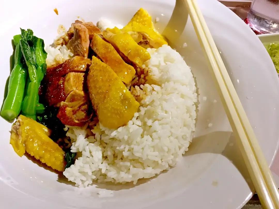 香港连锁快餐店的一份油麻鸡饭,几块鸡肉,两根菜心,48港币