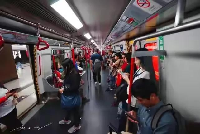 香港地铁的票价还是比较贵,动不动就要十几二十块钱港币,车厢虽然也是满座,但是站着的人不多,算是比较空的了
