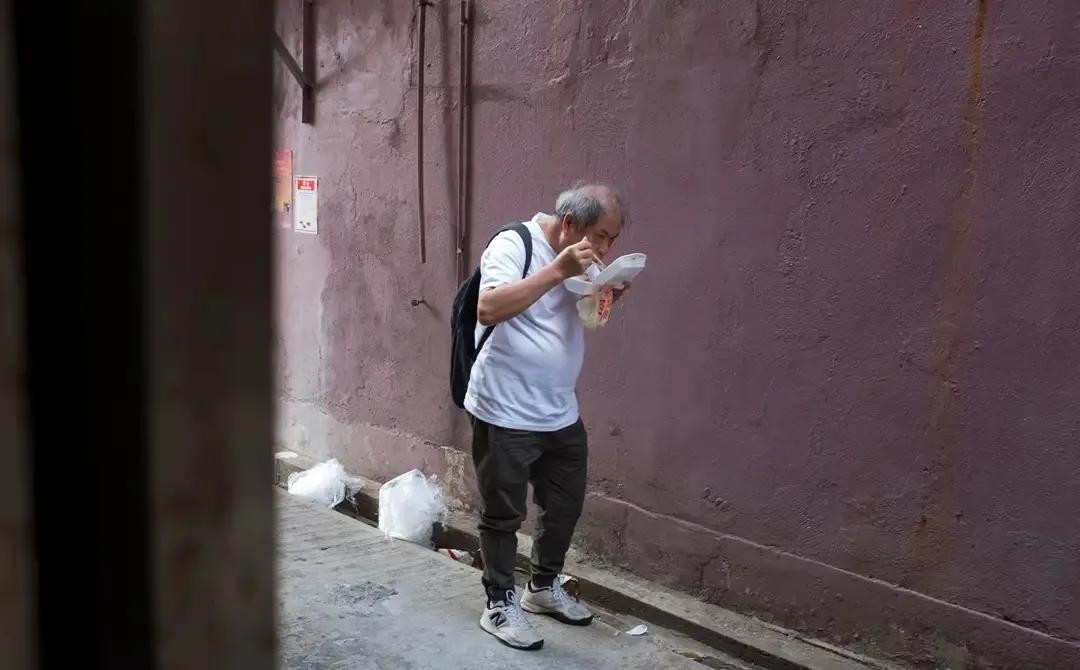 一位秃顶白发老人正在吃着盒饭