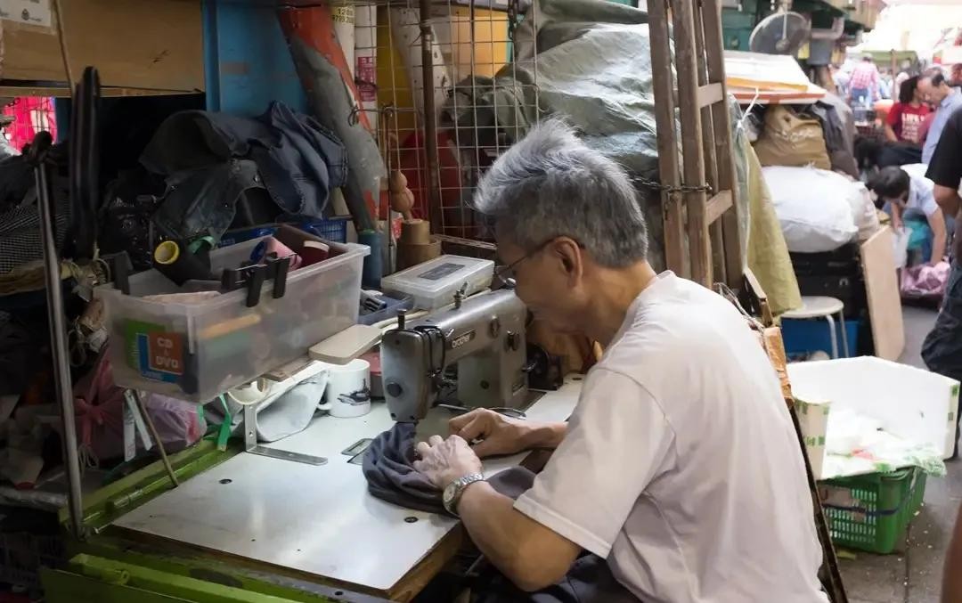 一位老裁缝正在工作,帮忙邻居修改,补补衣服,也以此挣点收入