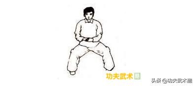 练法:①面对墙壁,两脚左右开立,两腿屈膝半蹲成马步。两臂屈肘,两手移至腹前,两手的食指、中指伸直,其余各指握拢于掌心。宁静,气沉丹田,调均呼吸20次(图23)。