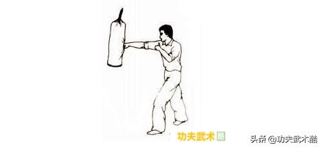 把不同的砂袋放好,分别用拳、掌、腿击打砂袋,力量由小到大,砂袋由轻到重。拳、掌、腿的每种打法应各在300次以上(图34、35、36)。