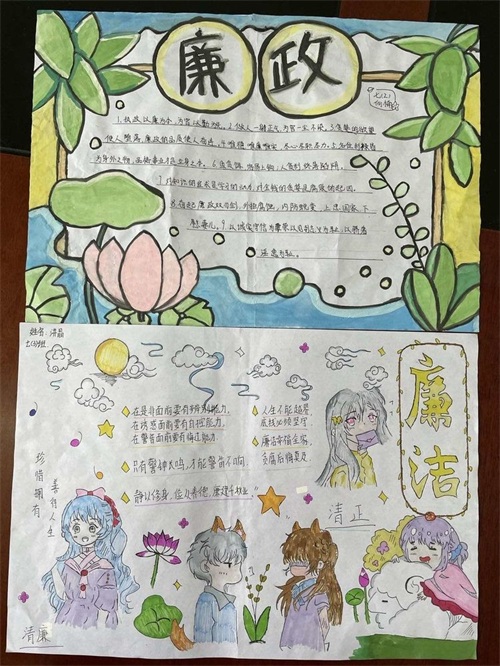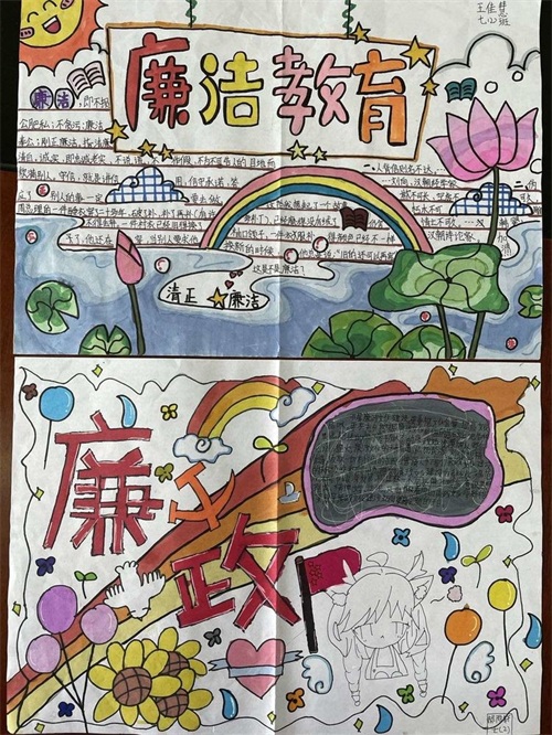 本次手抄报以班级为单位,各班班主任积极组织学生利用课余时间,围绕“敬廉崇洁”这一主题,创办了一张张布局合理,标题醒目,创意新颖,图文并茂,内容丰富,色彩灵动的手抄报作品,紧扣校园廉政文化主题,揭示教育警示意义,使学生在润物无声中受到了教育。