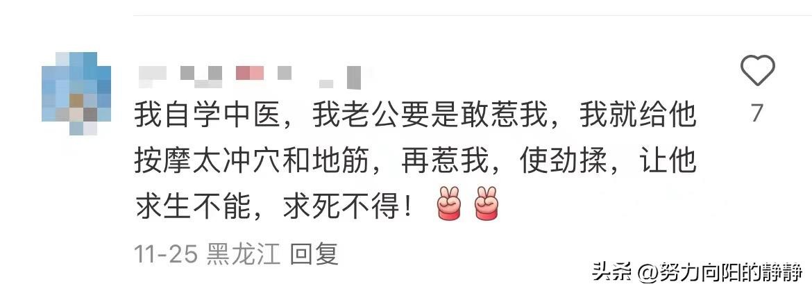 我自学中医,我老公要是敢惹我,我就给他按摩太冲穴和地筋,再惹我,使劲揉,让他知道我的厉害!